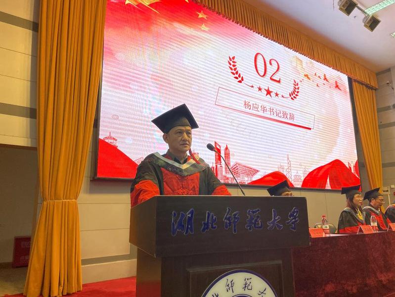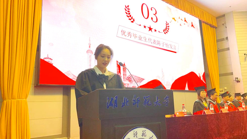 地理信息科学专业陈子怡同学作为优秀毕业生代表发言。她表达了对母校、师长的感恩、不舍与美好祝福,并表示在今后的学习工作生活中会继续发扬湖师大校训精神,续写新的青春篇章。