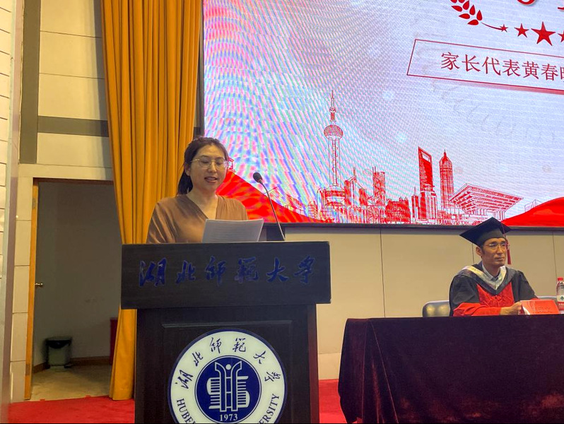 地理信息科学专业黄嫣然同学母亲黄春晓作为毕业生家长代表发言。她由衷地感谢学校、老师为青年成长保驾护航,帮助员工起航人生新里程。