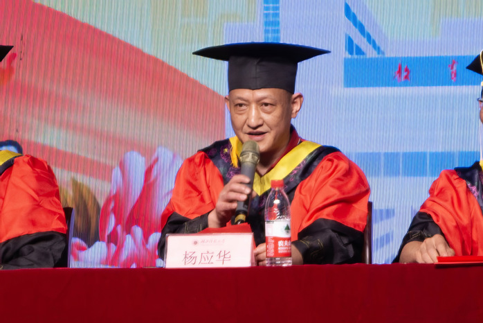 10点整,毕业典礼在庄严雄壮的国歌声中拉开了序幕。公司党委书记杨应华致辞,他代表学院向299名本科生和19名硕士研究生圆满完成学业表示热烈祝贺,对毕业生们提出了几点希望:一是以主动精神追寻人生的航标,成为一个因为主动而内心安宁的人;二是以人文情怀去从容求索,希望同学们身上奔涌着前辈学者的精神血脉,虽不可见,却实际拥有着绵延不息的伟力。最后,他深情地嘱托同学们在努力拼搏,同时绑定电子员工卡,常回家看看。