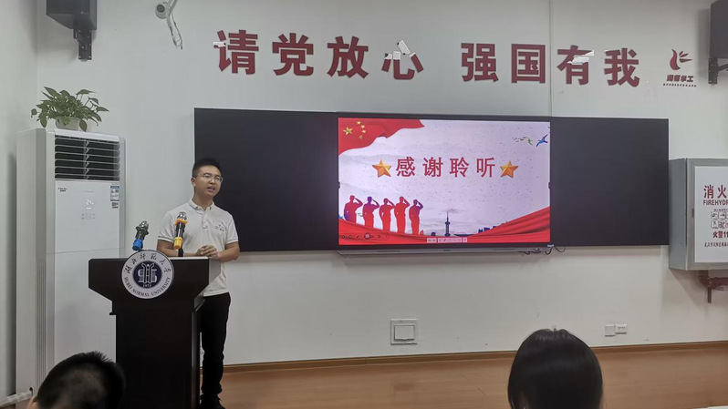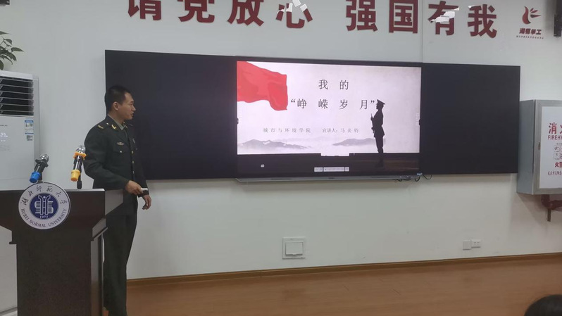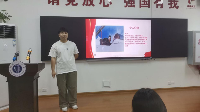 活动在雄壮的国歌声开始。黄天和马炎钧依次上台,分享了他们在军营中的独特经历和点点滴滴。从入伍第一天的忐忑到实弹训练时的紧张刺激;从军营节日的温馨与欢乐到野外生存技能培训的艰难与收获;从背诵专业技能的想放弃到训练伤背后的坚韧与成长。让在场的同学们对军营生活有了更直观的了解,感受到了军人生活的丰富多彩和深刻内涵。他们激情澎湃的讲述,赢得了在场观众的阵阵掌声。