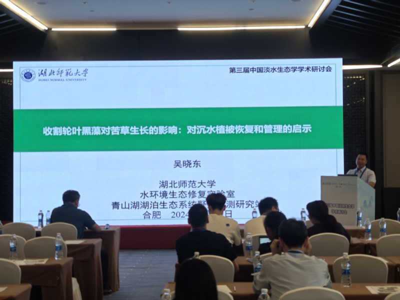本次学术研讨会以“万物共依:淡水生态系统的保护、修复与管理”为主题,主要包括“淡水生态系统与全球变化、淡水生态系统功能与生物多样性保护和受损淡水生态系统修复与管理”等议题,还设置了研究生论坛。吴晓东副教授在分会场以“收割轮叶黑藻对苦草生长的影响”为题做了报告。4位硕士研究生分别在研究生论坛做了汇报。