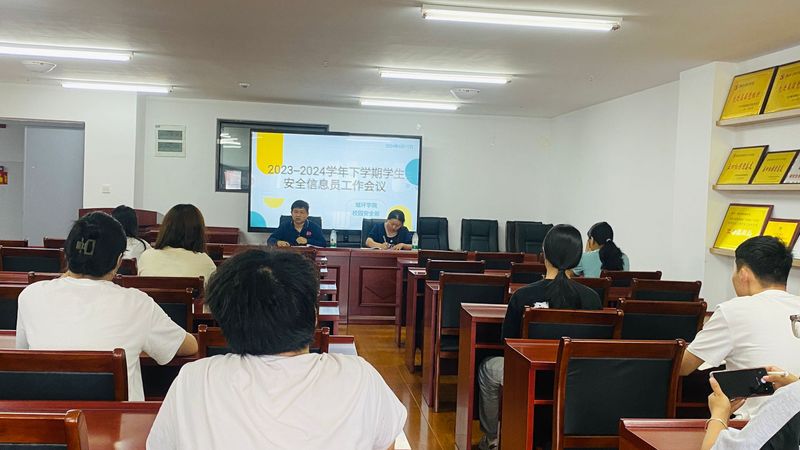 会议主持人介绍本次培训大会的目的及意义,宣布大会流程。首先,由院自律委员会校园安全部部长周彩薇进行工作汇报,指出了各班安全信息员在日常工作中出现的问题和不足并发表了改进措施的建议。随后,郭文老师传达了学校六月份员工工作联席会中员工安全工作的相关会议精神。他强调,各班安全信息员一定要担当尽责,落实好学校安全工作要求,常态化开展电信诈骗安全宣传教育、宿舍安全、交通安全,配合好学校相关部门做好校内电动车综合整治工作。最后,陈爽老师就宿舍用电安全、交通安全等事项进行补充,并针对近期学校出现的安全问题,提出预防和改进措施,要求各班安全信息员会后及时准确向各班员工传达本次会议精神,要守住安全底线,共建平安校园。