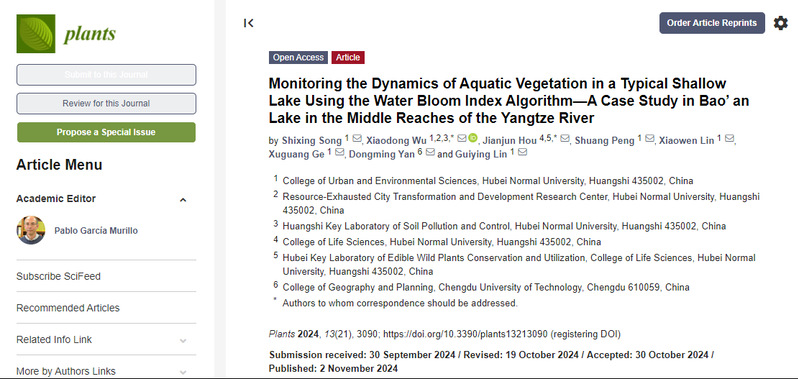 近日,城环学院水环境生态修复团队在中科院SCI二区期刊《Plants》上发表了题为“ Monitoring the Dynamics of Aquatic Vegetation in a Typical Shallow Lake Using the Water Bloom Index Algorithm—A Case Study in Bao' an Lake in the Middle Reaches of the Yangtze River ”的研究文章。该文第一作者为城环学院2021级环境工程专业本科生宋世兴,通讯作者为吴晓东副教授,侯建军教授为共同通讯,共同作者包括葛绪广副教授、林贵英博士,水环境生态修复实验室在读本科生和研究生。