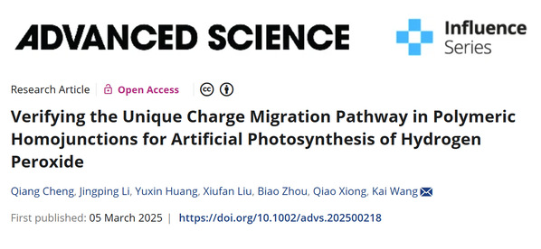 近日,公司程强博士在Wiley旗下综合性期刊《Advanced Science》上发表题为“Verifying the Unique Charge Migration Pathway in Polymeric Homojunctions for Artificial Photosynthesis of Hydrogen Peroxide”的研究型论文。《Advanced Science》为中科院一区TOP期刊,最新影响因子14.3,注重发表材料科学、物理、化学、医学、生命科学、环境工程等领域的前沿基础和应用研究。