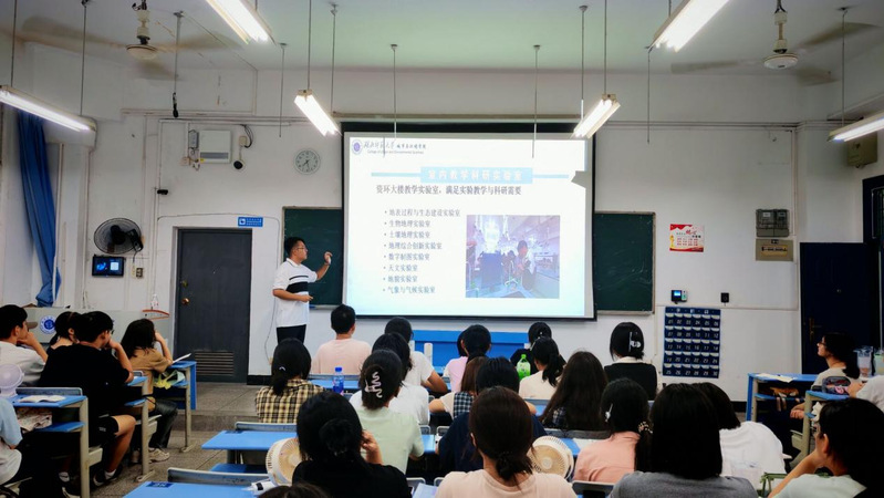 在介绍课程体系时,陈龑结合多媒体课件,展示了包括地理信息系统(GIS)、遥感技术与应用、环境监测与评估、区域分析与规划等专业核心课程的教学内容与应用实例。他还通过大量往届员工野外实习、地理测绘实践、科创项目研究等现场图片,生动再现了地理专业强调动手能力和实地解决现实问题的教学特色。实验室的高精度无人机、三维激光扫描仪、遥感图像处理平台等先进设备也首次以影像形式向新生亮相,引来阵阵赞叹。