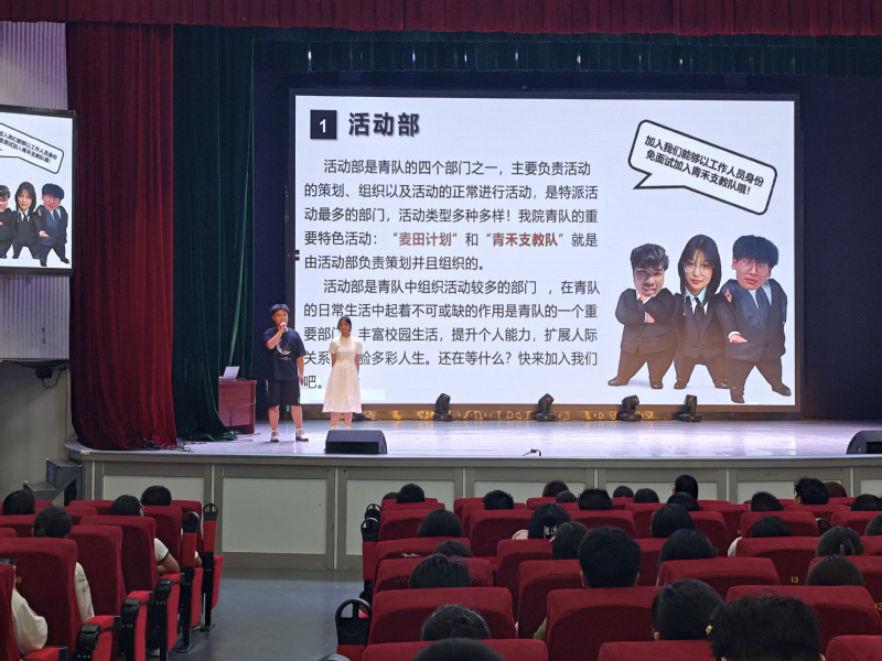 紧接着,青年志愿服务队登台分享。围绕“奉献、友爱、互助、进步”的志愿精神,负责人详细介绍了常规志愿项目的开展频率、参与方式及志愿时长认定机制,并分享了队员们在志愿服务活动中的成长体验与荣誉时刻,鼓励新同学积极投身志愿服务,践行环保理念,在奉献中锻炼自我、成就价值。