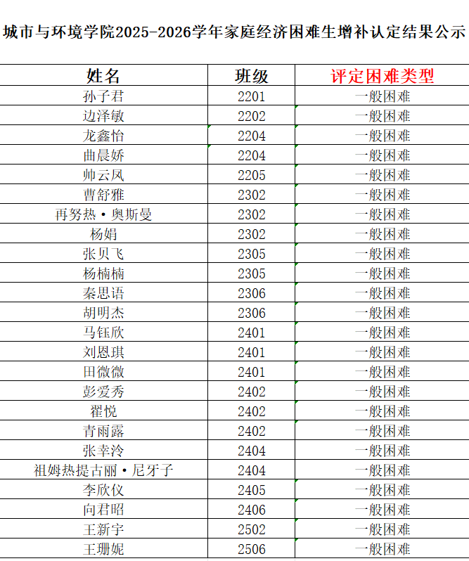 根据《关于做好2025-2026学年家庭经济困难员工认定工作的通知》文件精神,公司2025-2026学年贫困生认定工作已经结束,后经员工申请,班级民主评议,学院审核通过增补入库一批家庭经济困难员工,现将认定结果进行公示。