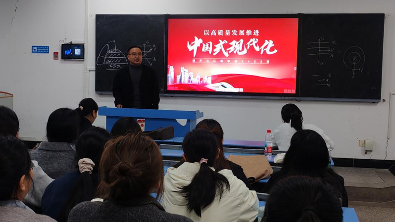 随后,班会围绕“中国式现代化”的主题展开深入学习。从内涵特征、战略安排、高质量发展路径等方面系统阐释了中国式现代化的核心要义,让同学们清晰认识到中国式现代化是立足中国国情的独具中国特色的创新之路,既彰显了现代化的普遍规律,更蕴含着中国智慧与中国方案。